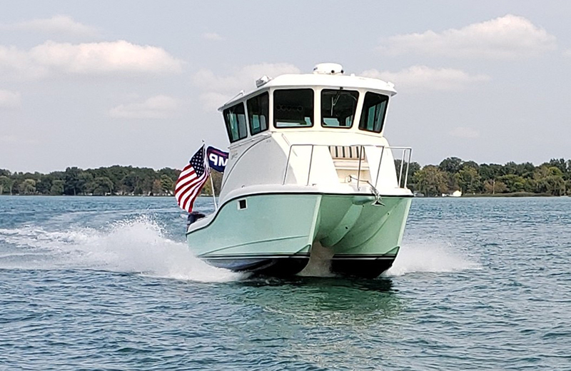 Catamaran motor centers range from 72” to 88” apart, allowing for better maneuvering around docks; A V-Hull is typically 24” apart. Most v-bottoms need bow thrusters and/or joystick controls for enhanced control and maneuverability in tight spaces.