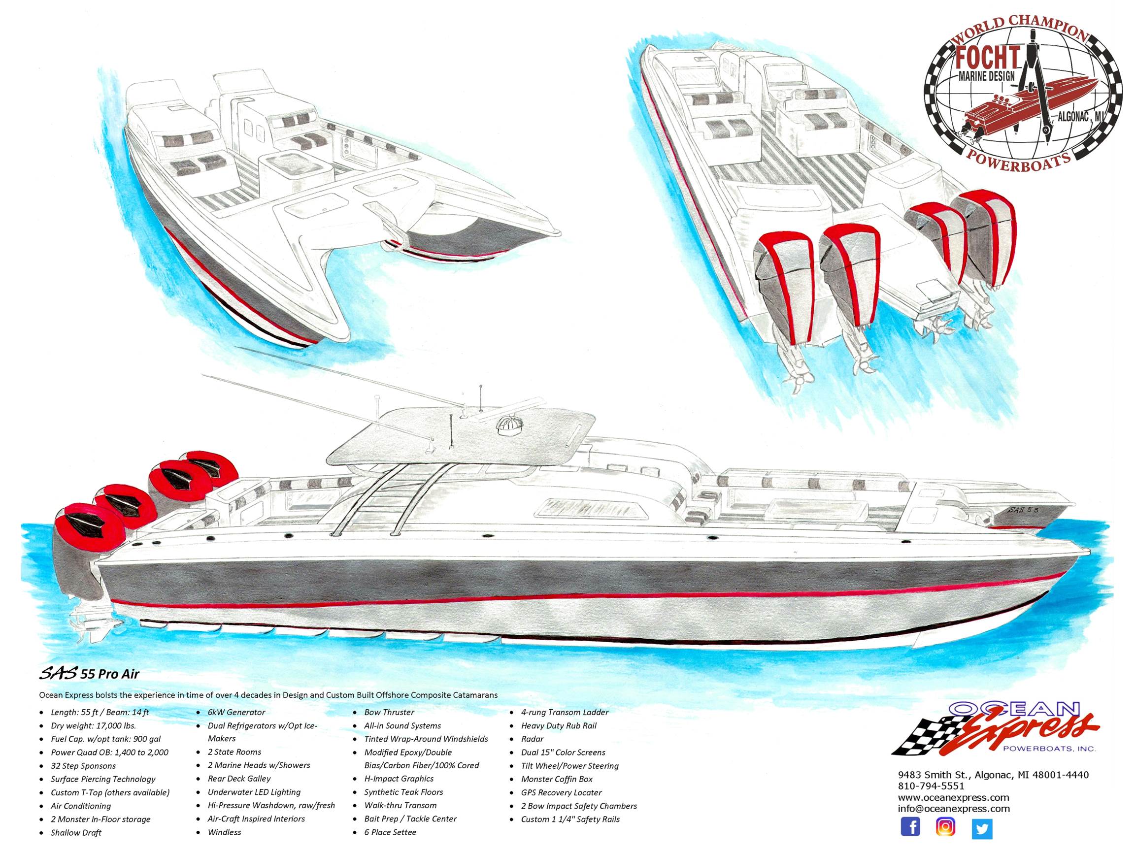 Ocean Express Powerboats has a proud history of over 43 years producing quality, power catamarans. Our custom, innovative design, and manufacturing process by Focht Marine Design has been the inspiration for several marquee powerboat brands, all of which have had various degrees of success in their own right.